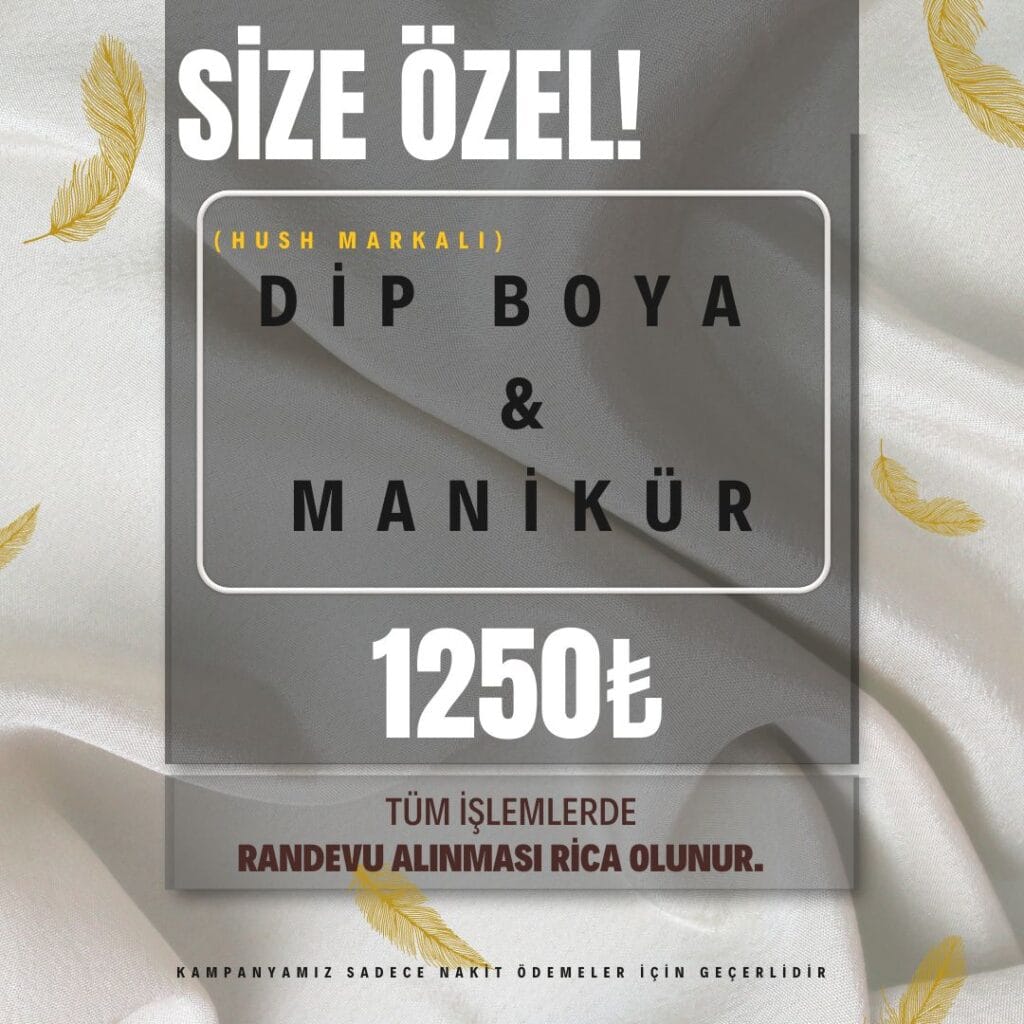 MÜŞTERİLERİMİZE ÖZEL HUSH DİP BOYA,MANİKÜR,PEDİKÜR 1800 TL YERİNE 1600 TL HUSH DİP BOYA-MANİKÜR-PEDİKÜR 1600 TL KAMPANYAMIZ 01.01.2025-31.03.2025 TARİHLERİ ARASINDA GEÇERLİDİR GEÇ KALMADAN RANDEVUNUZU ALIN RANDEVU ALMAK İÇİN BURAYA TIKLAYIN. GÜNCEL FİYAT LİSTEMİZ
